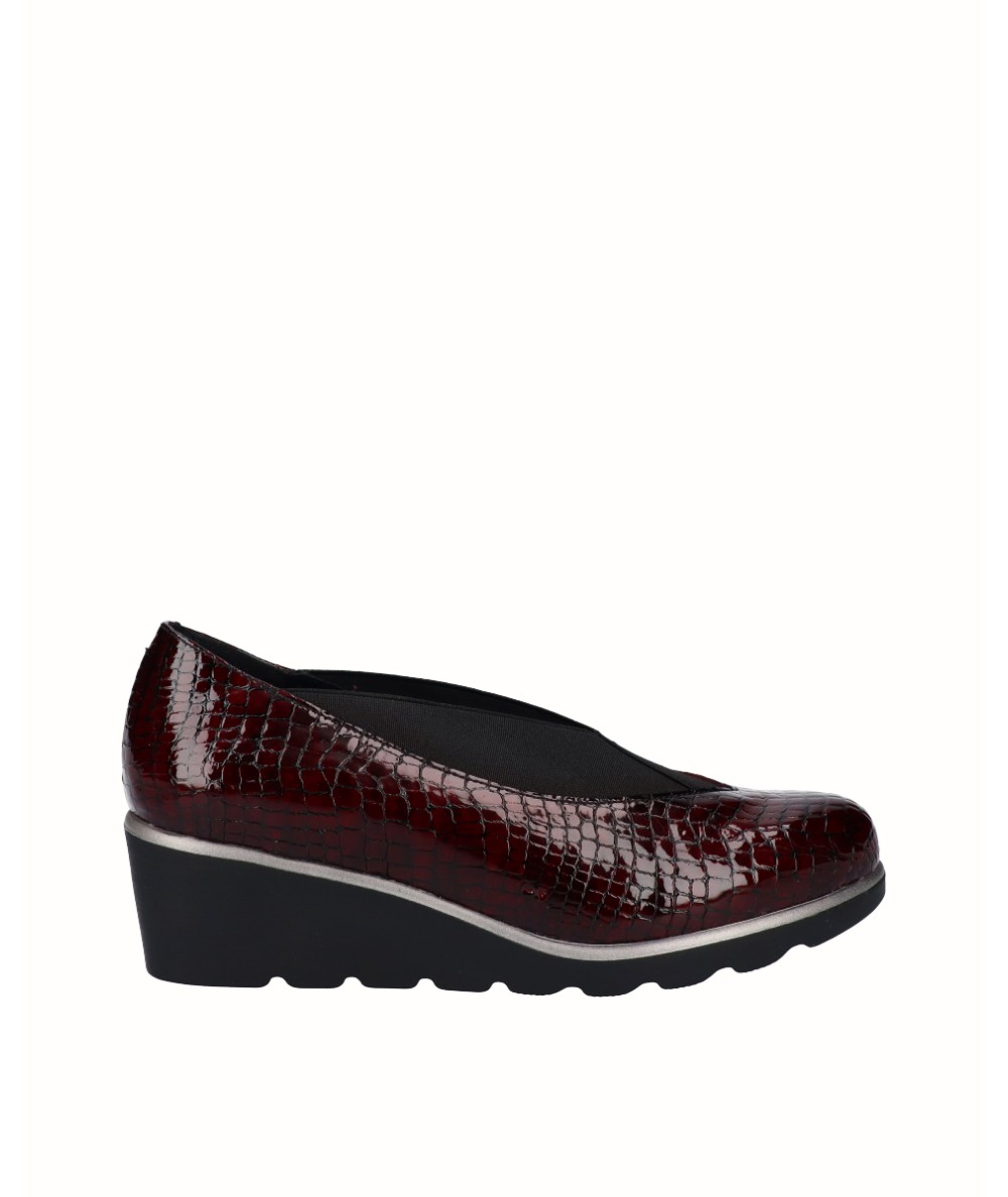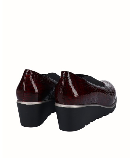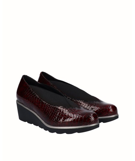 Zapato de cuña de 5 cm, con puntera redondeada, fabricado en piel grabada de alta calidad. Cuenta con un sistema de plantilla extraíble que nos aporta flexibilidad y confort en la pisada. Escote en "V" para estilizar el pie y elástico en el empeine para un ajuste óptimo. Comodidad, durabilidad y versatilidad de un calzado 100% español. Cuenta con la garantía de calidad de la marca D´Chicas.
