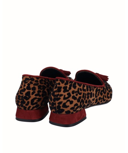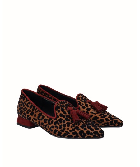 Zapato de tacón bajo de 2 cm, fabricado en tejido animal print de la mejor calidad. Cuenta con una plantilla de gel acolchada que nos aporta flexibilidad y confort en la pisada. Incluye adorno de borlas que le añade un toque elegante y sofisticado. Comodidad, durabilidad y versatilidad de un calzado 100% español. Cuenta con la garantía de calidad de la marca D´Chicas.