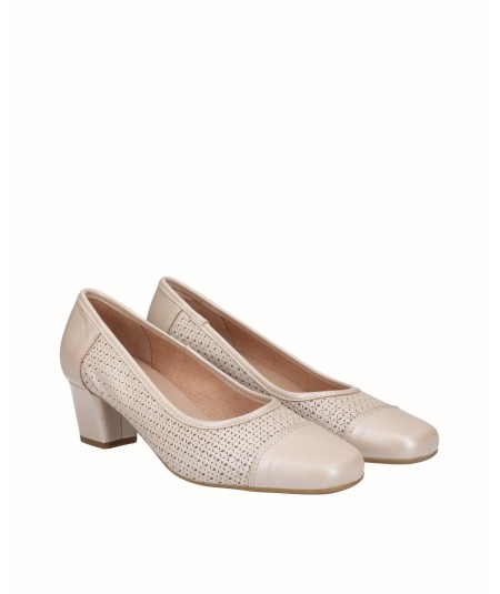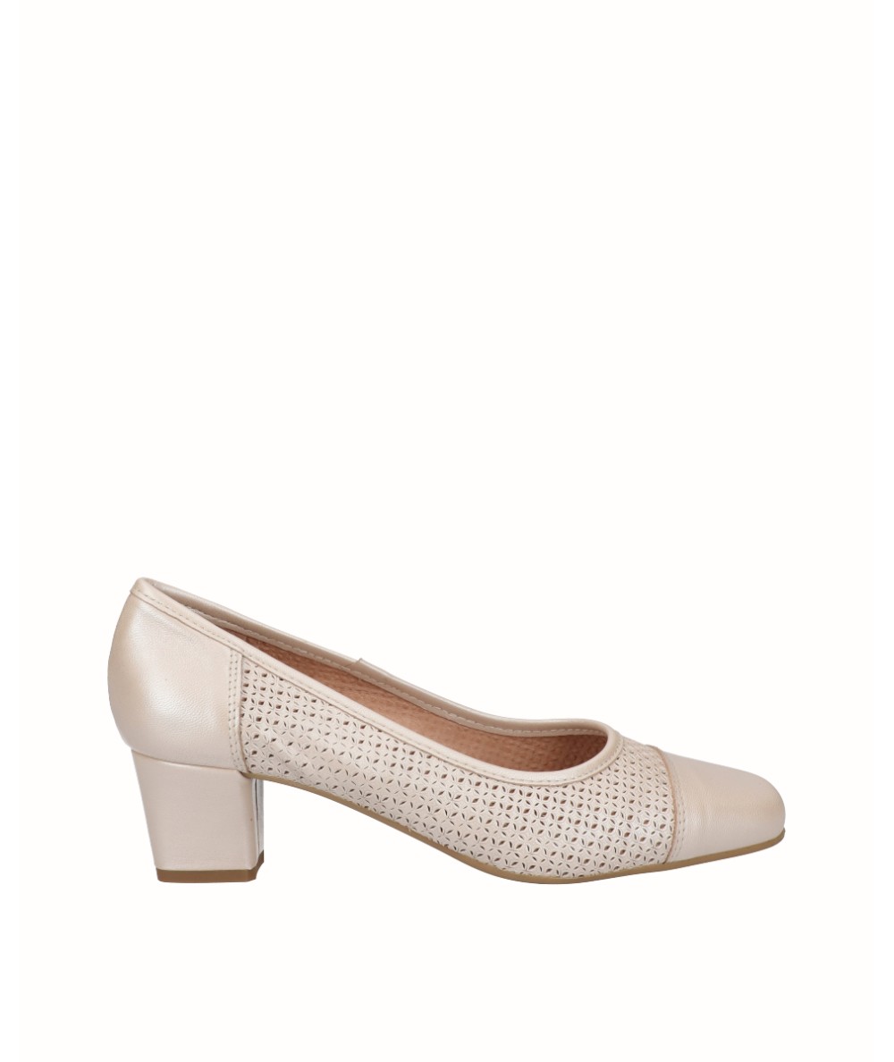 Zapato de tacón fabricado en piel nacarada de la mejor calidad, con plantilla de gel y plantilla extraíble. Adorno lazo. Cómodos, ligeros y elegantes, ideales para cualquier ocasión.